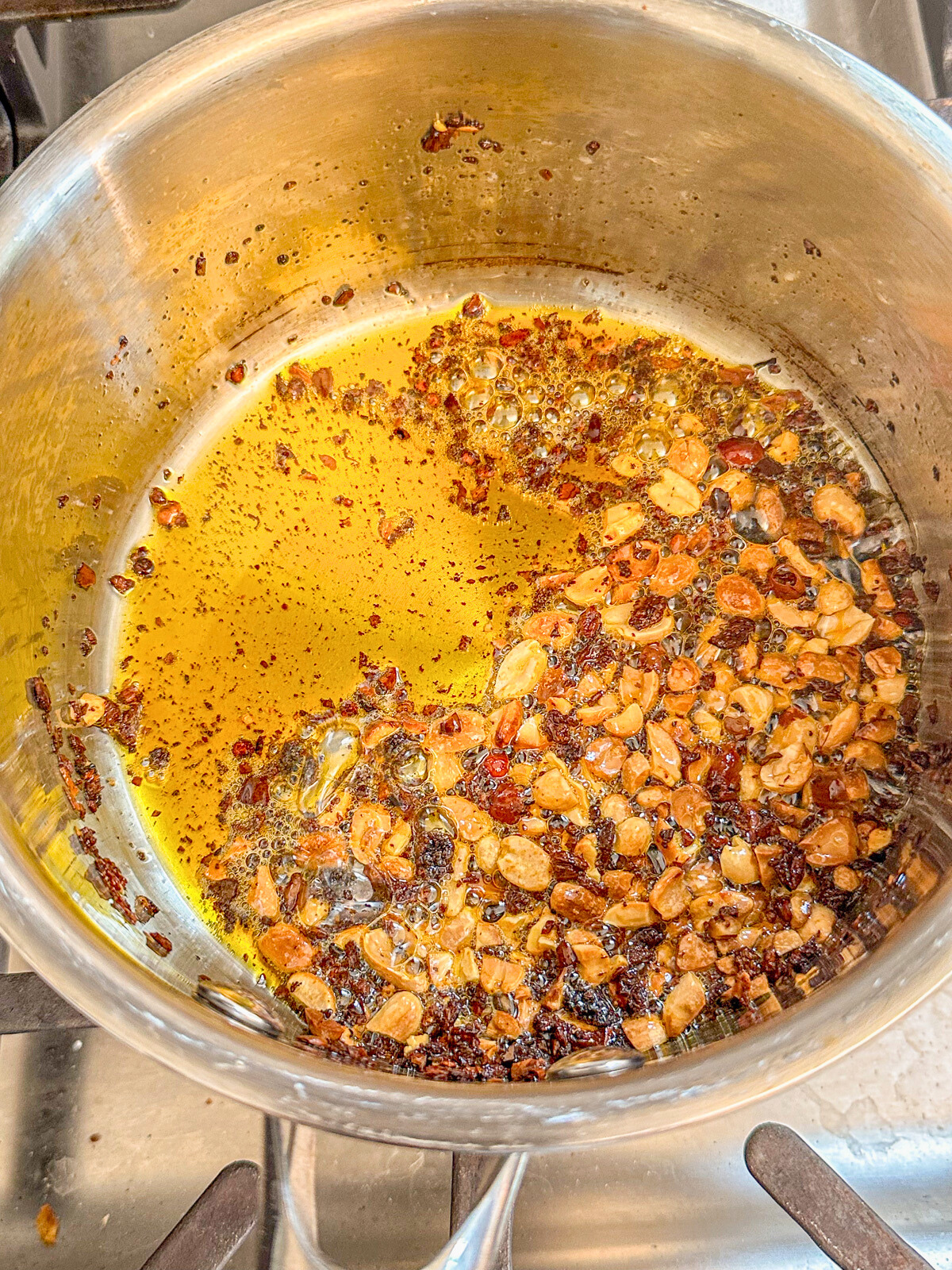 - Add your chopped peanuts in a small pot. Heat on low medium for one minute until your peanuts get a little toasted and golden on all sides. Then add 1 tablespoon of chili oil. Mix together for 30 seconds and turn off heat. The chili can burn quickly so be careful!
